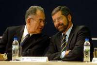 Javier Jim�z Espri�esidente de la Junta de Gobierno de la UNAM, y el rector Juan Ram�e la Fuente, durante la presentaci�el Programa Transdisciplinario en Investigaci� Desarrollo FOTO Notimex