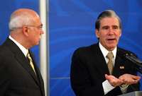 El vocero de la Presidencia de la Rep�a, Rub�Aguilar, escucha la exposici�el secretario de Salud, Julio Frenk, durante una conferencia de prensa en la residencia oficial de Los Pinos FOTO Marco Pel�