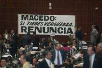 El repudio de un sector de diputados federales contra el titular de la Procuraduría General de la República (PGR), Rafael Macedo de la Concha, se manifestó ayer con una manta blanca colgada de un muro en el salón de plenos del Palacio Legislativo de San Lázaro: "Macedo, si tienes vergüenza, renuncia". En medio de la sesión ordinaria, los legisladores perredistas emprendieron otra acción de protesta pacífica al ubicarse bajo de la presidencia del órgano camaral mostrando ese mensaje.
