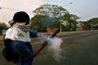 Managua, 28 de abril. Policías antimotines y estudiantes se enfrentaron esta tarde en el sector oriental de Managua, cuando los uniformados lanzaron gas lacrimógeno y balas de goma para desalojar a los manifestantes que bloqueaban las vías de acceso en dos sedes de la Universidad Nacional Autónoma de Nicaragua.