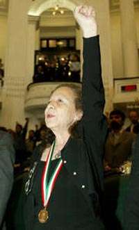 Rosario Ibarra de Piedra levanta el pu�zquierdo tras de recibir la Medalla al M�to Ciudadano, ayer, en la Asamblea Legislativa del Distrito Federal FOTO Mar�Luisa Severiano