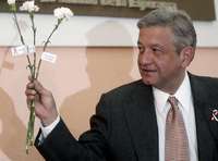 El jefe de Gobierno del Distrito Federal, Andr�Manuel L� Obrador, recibi� ramo de claveles de las redes ciudadanas participantes en la resistencia civil contra su desafuero, durante su conferencia de prensa de este viernes FOTO Francisco Olvera