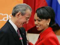 Rice recordó que acaba de regresar de una gira por la región, donde entre otros logros señaló el de alcanzar un "consenso" sobre aprobar a José Miguel Insulza como secretario general de la Organización de Estados Americanos, y dijo que esto marcaba una nueva era de cooperación y unidad en el hemisferio. Subrayó que durante los últimos 25 años se ha dado un cambio en la región, donde han sido expulsados los "asesinos, rateros y dictadores" al optar por la "democracia", al igual que se han dejado atrás los regímenes "de economías estatistas corruptas" que empobrecieron a sus pueblos.