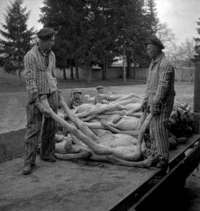 En imagen de finales de abril de 1945 en el campo de concentraci�azi de Dachau, cerca de Munich, jud� suben los cuerpos de sus compa�s a un tren de las tropas aliadas que lleg�liberarlos de las fuerzas alemanas FOTO Afp