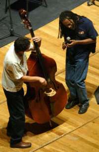 BUENO, EN REALIDAD ninguno de los grupos fue invitado por McFerrin, ya que éste los conoció apenas dos minutos antes de iniciar su clase magistral. No obstante, el contrabajo de Luri, el trombón de Rey David Alexandre (que llegó un cuarto de hora tarde), el piano de Mario Patrón, el sax tenor de Otis Ganzeda y la batería de Yuriani Sobrino sonaron es-tupendamente.