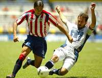 Francisco Palencia disputa el bal�on el defensor de Pumas Joaqu�Beltr� en el encuentro en que Chivas obtuvo el triunfo por 2-1. Pese al resultado, la victoria de Tigres sobre Puebla dej�era al equipo de Jorge Vergara FOTO Ap
