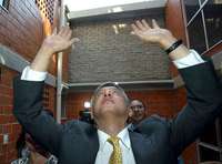 Andr�Manuel L� Obrador saluda a vecinos beneficiados con viviendas en la Miguel Hidalgo. Atr� el delegado Fernando Aboitiz FOTO Marco Pel�