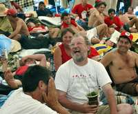 Joao Pedro St�le (centro), l�r de los campesinos sin tierra, bebe t�e mate durante una pausa en Alexania de la marcha hacia Brasilia FOTO Reuters