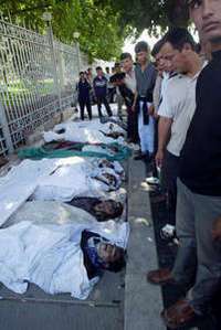 Residentes de Andizh� Uzbekist� ante la hilera de cad�res colocada en el patio de una escuela tras la represi�rdenada por el presidente Islam Karimov contra presuntos rebeldes isl�cos el fin de semana FOTO Ap