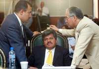 El diputado perredista Pablo Trejo conversa con un visitante en el recinto de Donceles y Allende durante la sesi�e la Permanente. Al centro, el legislador del sol azteca Francisco Chiguil FOTO Marco Pel�