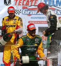 El ganador Bruno Junqueira (al centro) y Los canadienses Andrew Ranger y Alex Tagliani celebran el triunfo en la carrera efectuada en M�co FOTO Ap