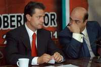 Enrique Pe�ieto, candidato de PRI-PVEM a la gubernatura mexiquense, y Jes�rillo, delegado del CEN del PRI, en conferencia de prensa dieron a conocer el balance de los gastos de campa�ealizados hasta la fecha