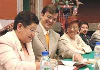 La administradora de los Servicios Educativos del Distrito Federal, Sylvia Ortega, y el secretario de Desarrollo Social del GDF, Marcelo Ebrard, durante la firma de los dos convenios FOTO Gerardo Flores