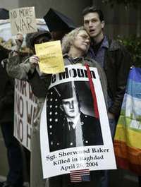 Celeste Zappala protesta contra la guerra en Irak durante un acto en Filadelfia al cual asisti�ta semana el secretario de Defensa, Donald Rumsfeld, con un retrato de su hijo mayor, muerto en Bagdad. La acompa�u hijo Dante FOTO Ap