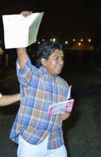 Portando un improvisado letrero en el que se leía: "Ni un voto más al PAN", el pintor fue recibido por aproximadamente 154 miembros del movimiento altermundista. El grupo se dirigió al plantón que mantiene en el centro de la ciudad, donde el excarcelado anunció que permanecerá ahí hasta que el resto de sus compañeros sea liberado.
