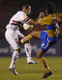 Syndey Balderas, de Tigres (derecha), comete faul al paulista Souza FOTO Ap