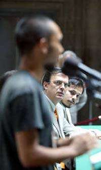 El secretario de Desarrollo Social, Marcelo Ebrard, y el director del Instituto de la Juventud del DF, Pablo de Antu�, escuchan la intervenci�e Erick S�hez, durante la entrega de reconocimientos a beneficiarios del Programa de Atenci� J�es en Situaci�e Riesgo FOTO Guillermo Sologuren
