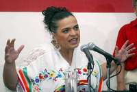 Beatriz Paredes Rangel durante la conferencia de prensa que ofreci�er en un local improvisado, ante el desalojo del bar donde estaba programado el acto FOTO Carlos Cisneros