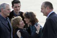 Encuentro de Florence Aubenas con su madre, Jacqueline. Observan el presidente Jacques Chirac (derecha) y el padre de la periodista liberada, Benoit FOTO Ap