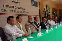 El ombudsman nacional, Jos�uis Soberanes Fern�ez, exigi� estricta aplicaci�e la ley como mecanismo para frenar la ola de violencia que azota al pa� Subray�e la ley no es negociable y debe aplicarse para que se d�l ejercicio estricto de la justicia. Durante la firma de tres convenios de capacitaci�ntre la CNDH y el gobierno de Hidalgo, le acompa�de izquierda a derecha: Mario Mac� Mu� Ra�ascencia Villanueva, el gobernador de la entidad, Miguel Angel Osorio Chong, Alejandro Straffon Ortiz, Jos�lberto Rodr�ez, Jos�rancisco Olvera, Marcos Manuel Souberville y Jes�ime