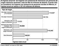 Las percepciones de las familias con presencia de connacionales y/o personas de origen mexicano superan 406 mil millones de dólares (ver gráfica), pero en los hogares con presencia de personas nacidas en México el ingreso se reduce a 187 mil millones de dólares. Este sector es de las remesas.