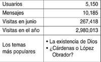 Tenemos un nuevo software que permite medir la actividad en el foro de la comunidad de internautas de las columnas Dinero y Domingo, el cual está en vías de convertirse en uno de los más dinámicos de habla hispana. Pronto se abrirá el de Los Angeles. Estadísticas: