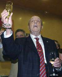 Brindis de Manuel Fraga, de 83 a� que aspira a su quinta relecci�n Galicia, sin embargo, deber�sperar al conteo de votos de residentes en el extranjero para saber si su partido, el PP, podr�obernar con mayor�absoluta o requerir�e una coalici�on socialistas y nacionalistas FOTO Ap