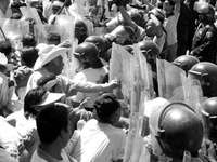 Puebla, Pue., 20 de junio. Elementos de Seguridad Pública del municipio de Puebla y del Comando Canófilo -con perros amaestrados- desalojaron a pobladores de la junta auxiliar San Francisco Totimehuacan, que durante casi dos meses mantuvieron en su poder las instalaciones de la delegación de gobierno en su comunidad. Alrededor de mil personas pretendieron evitar la expulsión y se enfrentaron en dos ocasiones a los policías con piedras, palos y resorteras. Los zafarranchos dejaron saldo de diez detenidos y más de 30 lesionados, entre ellos tres reporteros y diez policías.