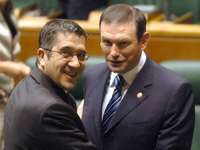 El lehendakari Juan Jos�barretxe (derecha) es felicitado por Patxi L�, candidato del PSE, luego de ser relecto como jefe del gobierno vasco FOTO Efe