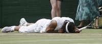 El espa�Rafael Nadal qued�ndido en el pasto de Wimbledon luego de perder ante Gilles Muller FOTO Ap