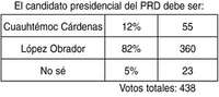 AMLO HUBIERA OBTENIDO 85 por ciento de las preferencias pero unos días antes de que terminara la encuesta el subcomandante Marcos le lanzó un demoledor ataque. Las preferencias bajaron tres puntos, concluye con 82 por ciento. De cualquier modo está muy adelante de Cuauhtémoc Cárdenas, quien reunió 12 por ciento. 438 miembros del foro Dinero -una columna sin lectores, todos somos autores- contestaron la encuesta que contenía una pregunta con tres opciones de respuesta: "El candidato del PRD debe ser: a) Cuauhtémoc Cárdenas. b) López Obrador y c) No sé".