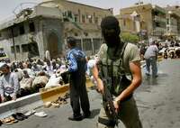 Un guardia embozado y un polic�resguardan una jornada de oraci�e musulmanes, en Bagdad FOTO Ap