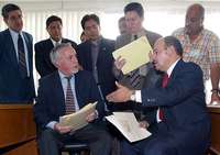 Roberto Vega Galina (derecha), l�r del SNTSS, y Marcelo Castro, director adjunto de la oficina de la OIT en M�co, luego de que la representaci�indical entreg� queja contra el gobierno federal por la violaci� los convenios 87 y 102 del organismo internacional FOTO Marco Pel�