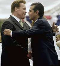 Luego de asumir la alcald�de Los Angeles, Antonio Villaraigosa es felicitado por Arnold Schwarzenegger, gobernador de California FOTO Ap