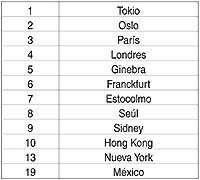 AUNQUE NOS QUEJAMOS todos los días de que el dinero no alcanza, el costo de la vida en el Distrito Federal es menor que en otras capitales del mundo, al menos eso es lo que dice la revista The Economist, publicada en Inglaterra, aunque su mayor número de lectores se encuentra en Estados Unidos. México ocupa el lugar número 19 entre las más caras. Tokio, París, Seúl y Hong Kong continúan en los primeros lugares. ¿Entonces, por qué no nos alcanza la lana? Es que los mexicanos estamos entre los ciudadanos del mundo peor pagados.
