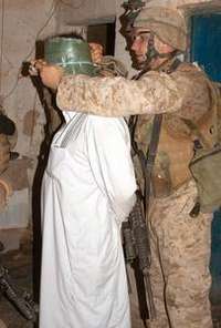Un soldado estadunidense cubre el rostro de un iraqu�ue fue detenido en Ramadi FOTO Reuters