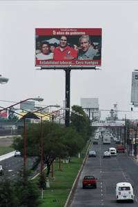 Espectacular del gobierno de Arturo Montiel en el cual se asegura que ha habido "cero huelgas" FOTO Angel Morales