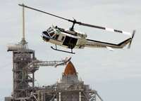 Un helic�ro de seguridad cuida del transborador Discovery en la plataforma de lanzamiento FOTO Reuters