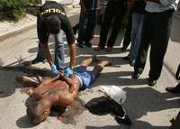 Un polic�quita el par de esposas con el que fue hallado ayer el cuerpo del periodista haitiano Jacques Roche, secuestrado el domingo pasado FOTO Reuters
