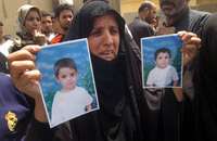 Una madre iraqu�uestra en Bagdad fotos de sus dos hijos muertos en el atentado de Musayeb FOTO Ap