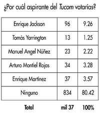 SEGUN LA TENDENCIA que se advierte en los resultados de la encuesta de esta semana, sería el senador Enrique Jackson el candidato del Tucom que enfrente a Roberto Madrazo en el proceso final de elección del candidato priísta a la Presidencia de la República. Aventaja claramente a los demás tucomes: Arturo Montiel, Manuel Angel Núñez Soto, Tomás Yarrington y Enrique Martínez. La encuesta contiene una pregunta específica: ¿Por cuál aspirante del Tucom votarías? La mayoría contestó "por ninguno". Pero el segmento que optó por alguno de ellos inclinó claramente la balanza en favor del senador Jackson.