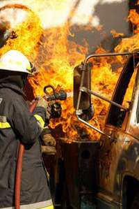 Acci�e los bomberos para extinguir el fuego en una gr�ue se gener�ando era cargada de gas clandestinamente, en la colonia Pensil FOTO Alfredo Dom�uez