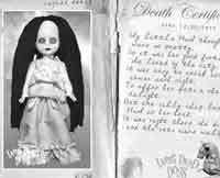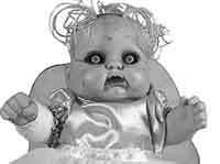 POR SUPUESTO, ES posible alcanzar niveles superiores de enfermedad. Otra moda es la de las Living Dead Dolls (muñecas muertas vivientes, digamos), fabricadas por Mezco Toyz: "perfectas para el coleccionista con oscuro sentido del humor", estas cosas miden diez pulgadas de alto, tienen cabello enraizado, y cada una se entrega en su propio ataúd y con su respectivo certificado de defunción. "We've passed away,/ now it's time to play" (ya nos morimos, ahora jugamos), es el eslogan de una de las organizaciones de usuarios de estos artefactos fabricados, según Mezco Toyz, "con pura maldad al viejo estilo". La firma Unearthly Possessions comercializa, además, cuadernos y loncheras con motivos impresos de las muñecas difuntas.