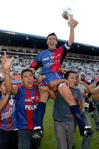 Chamagol Gonz�z festeja el triunfo de su equipo con el trofeo en manos FOTO Notimex