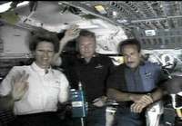 La comandante del Discovery, Eileen Collins (EU), y sus compa�s Andy Thomas (Australia) y Charlie Camarda (EU), en conferencia de prensa ayer, durante el quinto d�de misi�OTO Reuters