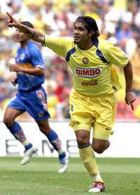 Celebraci�el americanista Reinaldo Navia luego de cobrar una pena m�ma y anotar el tercer gol de su equipo FOTO Reuters