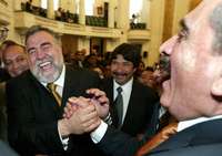 Alejandro Encinas bromea con el senador Pablo G� despu�de tomar protesta como jefe de Gobierno del Distrito Federal sustituto, ante el pleno de la ALDF FOTO Jos�arlo Gonz�z