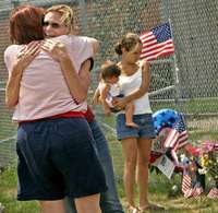 Familiares de los marines ca�s esta semana en Irak, se consuelan en el altar improvisado en la barda de las instalaciones del batall�l cual estaban adscritos en Brook Park, Ohio FOTO Ap