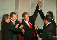 Felipe Calderón salió victorioso de la primera "pasarela" de precandidatos panistas a la Presidencia de la República. Ausente Santiago Creel, con Alberto Cárdenas Jiménez acartonado, el michoacano aprovechó sus dotes de orador. Dijo estar preparado para "cargar" con la decepción de algunos electores por este gobierno, presumió que vivió un año "fuera del presupuesto", pero aclaró que no tiene "resentimiento" hacia Vicente Fox por su abrupta salida de la Secretaría de Eenergía y que no piensa llevar a su esposa al gabinete.
