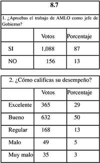 EL TRABAJO DE AMLO como jefe de gobierno del Distrito Federal fue calificado con 8.7 por las mil 249 personas que participaron en la encuesta de esta semana. Las respuestas a la segunda pregunta matizaron los resultados: 50 por ciento calificó su desempeño como "bueno" pero sólo 29 por ciento le dio boleta de "excelente". Un 21 por cien- to de los encuestados, por lo demás, opinó que fue "regular", "malo" o "muy malo".